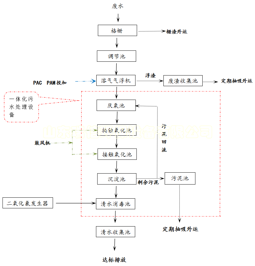 廢水首先經(jīng)過機(jī)械格柵進(jìn)入處置系統(tǒng),格柵可以去除廢水中較大粒徑的懸浮物、漂浮物、皮毛、肉屑、骨屑、血污等雜質(zhì),出水進(jìn)入隔油調(diào)理池,此池前部為隔油池,去除廢水中部分油脂,后部為調(diào)理池,對水量及水質(zhì)中止調(diào)理。調(diào)理池出水由提升泵提升至氣浮池,氣浮采用一元化氣浮裝置,它由池體,溶氣罐、空壓機(jī)及回流水泵組成,由一個(gè)電控箱中止控制操作。廢水中有大批的粗大懸浮物及油脂,經(jīng)過氣浮裝置的處置可大大降低上述污染物濃度,在氣浮設(shè)備義務(wù)時(shí)參與高分子絮凝劑,廢水經(jīng)加藥反響后進(jìn)入氣浮池內(nèi),與經(jīng)過TJ型釋放器釋放的氣泡充分混合接觸,使水中的絮凝體粘附在宏大氣泡上,釋放的氣泡平均直徑Φ30um左右,絮體浮向水面構(gòu)成浮渣,浮渣聚集到一定厚度后,由刮渣機(jī)刮入氣浮泥槽道送到污泥濃縮池,氣浮池下層的清水一部分經(jīng)溶氣泵抽送供溶氣水運(yùn)用,剩余的清水經(jīng)過溢流管進(jìn)入后續(xù)處置單元。氣浮可以去除80—90%的懸浮物和40—50%的CODcr。同時(shí),由于在氣浮池內(nèi)參與了混凝劑,與廢水中的磷酸鹽反響,生成更難溶于水的鹽類,從而將廢水中的磷較好的去除,添加了后續(xù)除磷處置單元的負(fù)荷。
